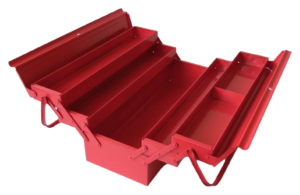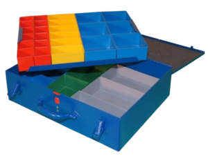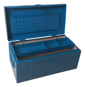 Solidna kaseta narzędziowa wykonana ze stali i malowana proszkowo, zapewniająca trwałość i odporność na uszkodzenia. Zamykana jest na dwie klamry oraz dodatkowy przycisk, a wnętrze może być puste lub wyposażone w pojemniki z tworzywa sztucznego w różnych rozmiarach, tak aby zawartość nie wysypywała się podczas przenoszenia. Kaseta posiada wygodną rączkę i dostępna jest w różnych gabarytach, dopasowanych do potrzeb użytkownika.